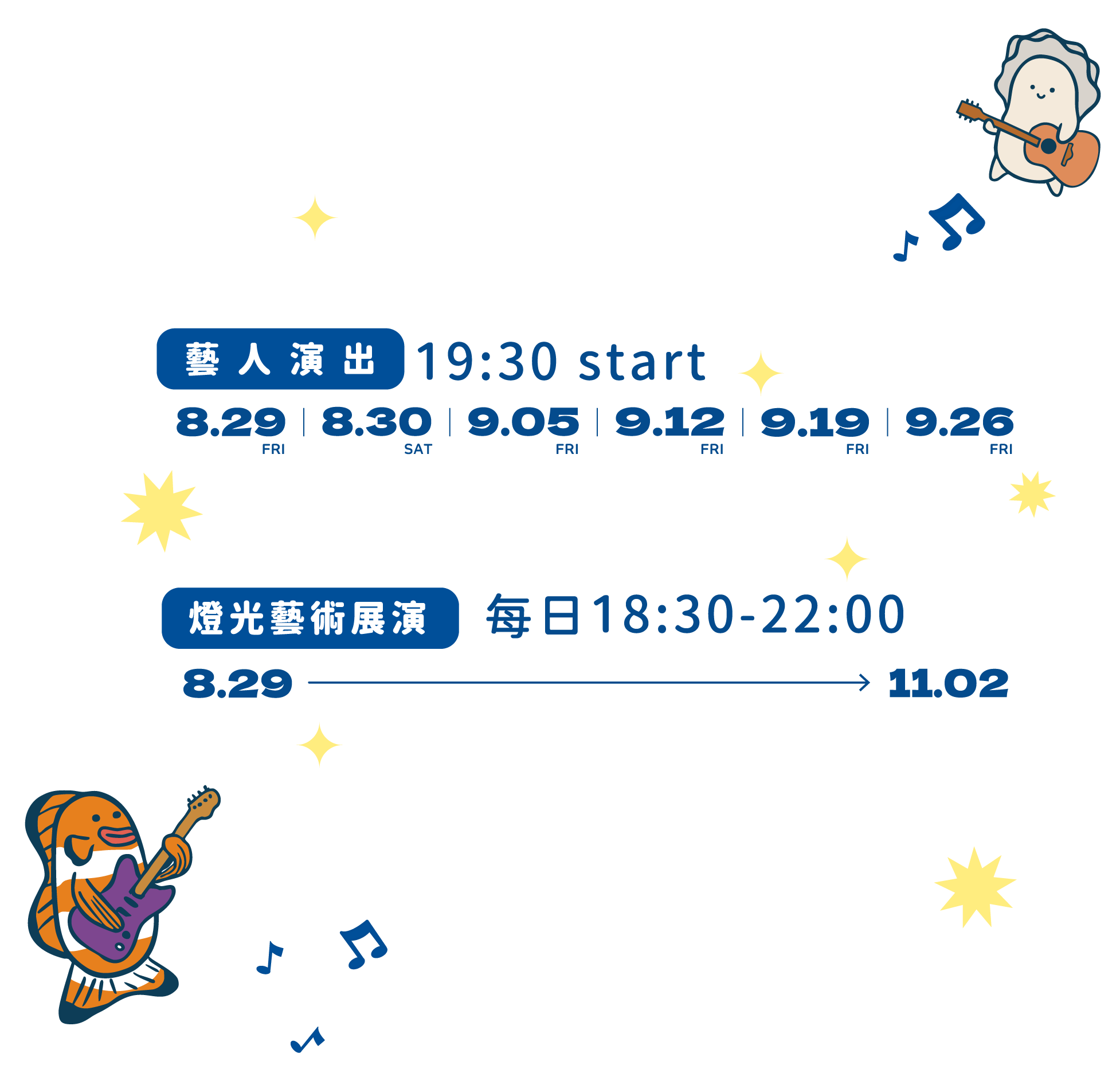 除了音樂表演,今年的燈光藝術展演「光島盛典」也全面升級,展期自8月29日至11月2日,導入光影互動科技與藝術燈飾,讓夜晚的觀音亭搖身一變為夢幻光感島嶼,邀你沉浸在最浪漫的海島夜色中。
