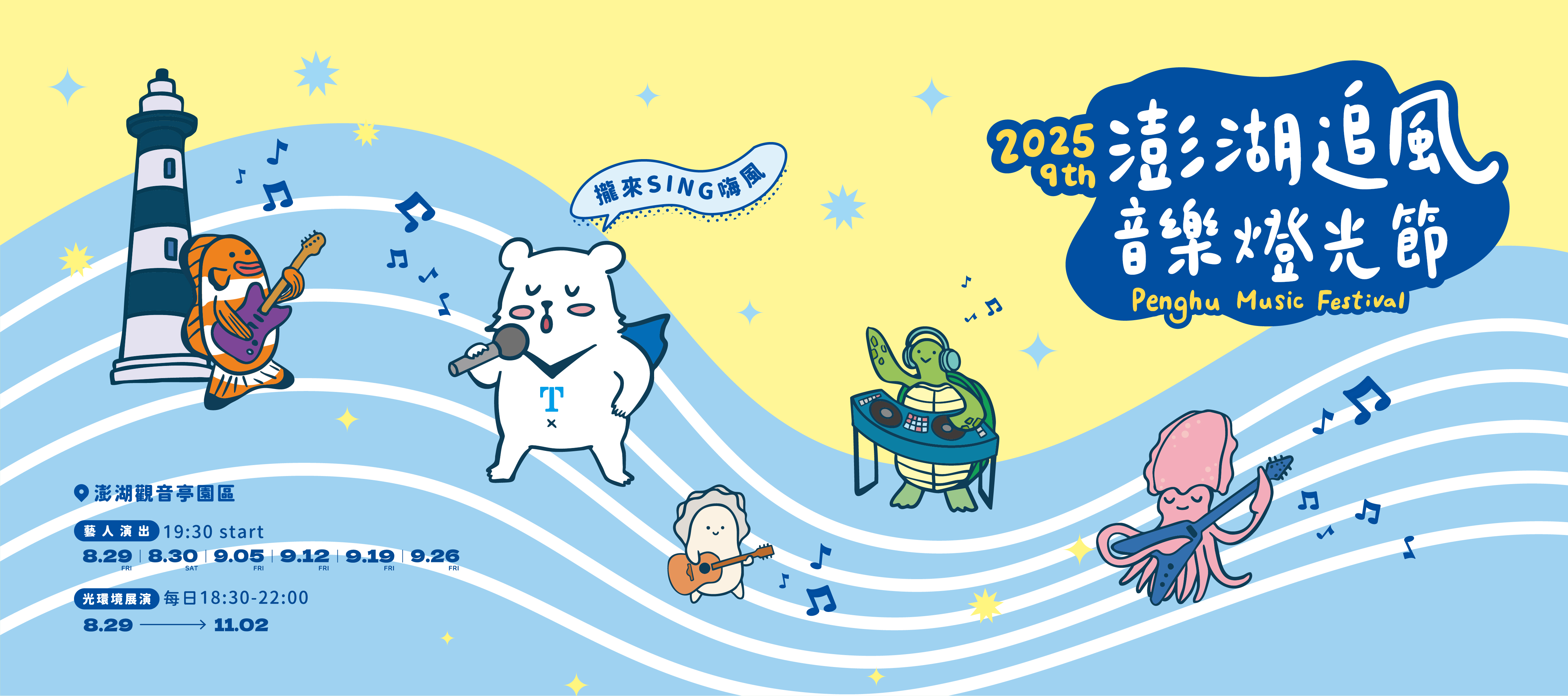由交通部觀光署澎湖國家風景區管理處主辦的「2025澎湖追風音樂燈光節」邁入第九屆,今年以「海島樂園」為主題,串聯音樂、燈光藝術、旅遊、優惠四大主軸,打造秋季最強觀光品牌。舞台展演活動自8月29日至9月26日連續五週週五及8月30日(六)晚間於觀音亭盛大舉辦演唱會,總計六場演出,邀請超過20組實力與人氣兼具的藝人輪番開唱,週週驚喜,熱力不斷!